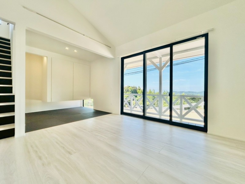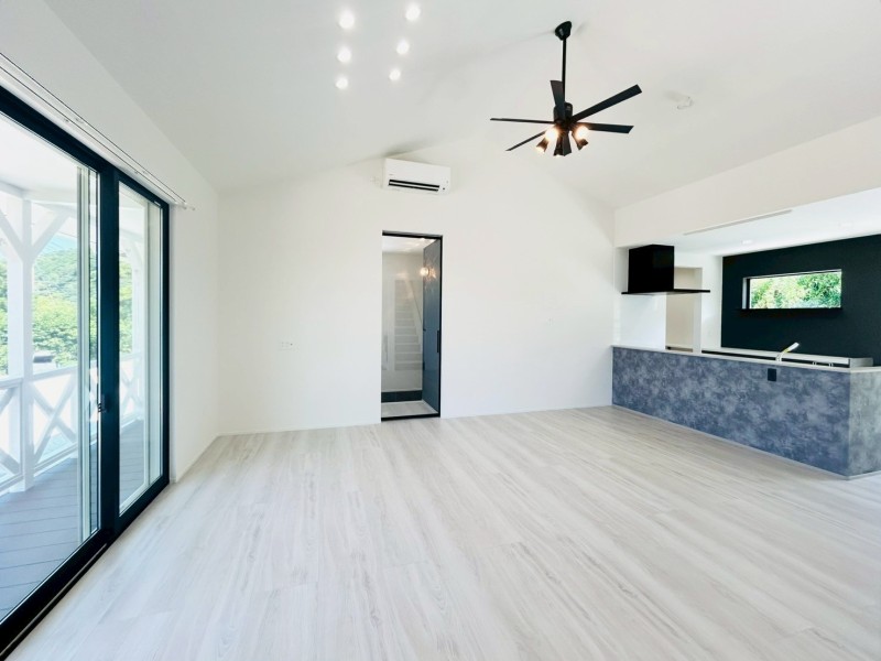 勾配天井の開放感や、カバードポーチへとつながる大きな窓、ガラスのリビングドアが生み出す光と抜け感。