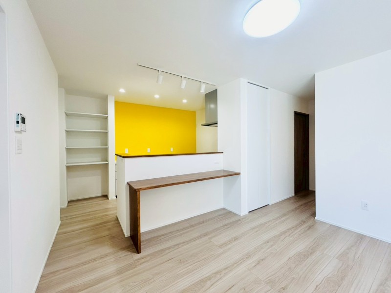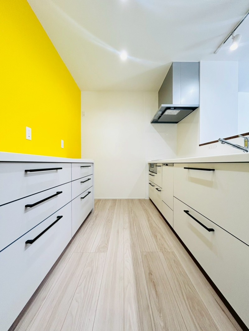 鮮やかなイエローのアクセントクロスが彩りをもたらすキッチンは